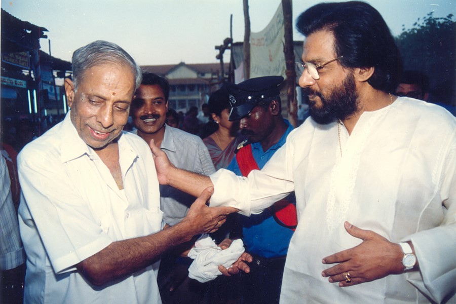 Padmabhushana Dr K J Yesudas in an interview had said “My concert every year at Sree Ramaseva Mandali is purely a prayer towards Lord Rama. I am continuing what my guru Chemabi Vaidyanatha Bhagavatar did and advised me to do so”. Dr.K.J.Yesudas was introduced to Sri S V Narayanaswamy Rao by the legendry Mrudangam artiste Sri T.V.Gopalakrishnan. Initially Dr.K.J.Yesudas used to give both duet concert with his guru and solo concert. He has been performing in the Mandali for the past 5 decades. After the death of Bagavatar, Sri S V Narayanaswamy Rao used to book the concert of K.J.Yesudas on 25th December every year and would give him the Mantralaya Prasadam along with an advance of `20/-. This practice is being followed even to this day. Like his revered Guru, Yesudas also has a great sentimental value attached with performing in Ramanavami Celebrations and shared a great bonding with Sri S V Narayanaswamy Rao. On 25th December 1999, Narayanaswamy Rao like every year met Yesudas along with his son Varadaraj and extended Christmas greetings after giving the customary Mantralaya prasada and token advance. With a divine urge Narayanaswamy Rao said to Yesudas that from next year Varadaraj will be coming to meet you and he requested Yesudas to extend his cooperation to Varadaraj like the way he had given to him. Sri S V Narayanaswamy Rao departed from this world exactly after 10 days from saying this i.e he expired on 5th January 2000. Even to this day Yesudas will perform at Mandali for a very nominal remuneration, which shows his respect for Sri S V Narayanaswamy Rao.